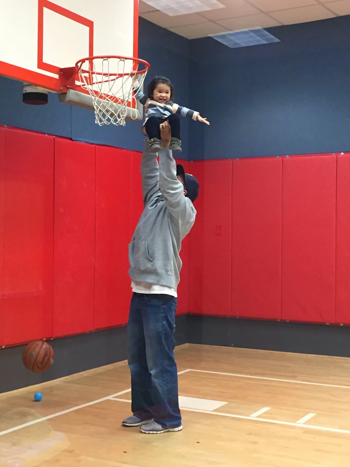 Mady is our active one! I think she going to love sports (much to Daddy's delight!). Here she is with Daddy, sinking a basket!